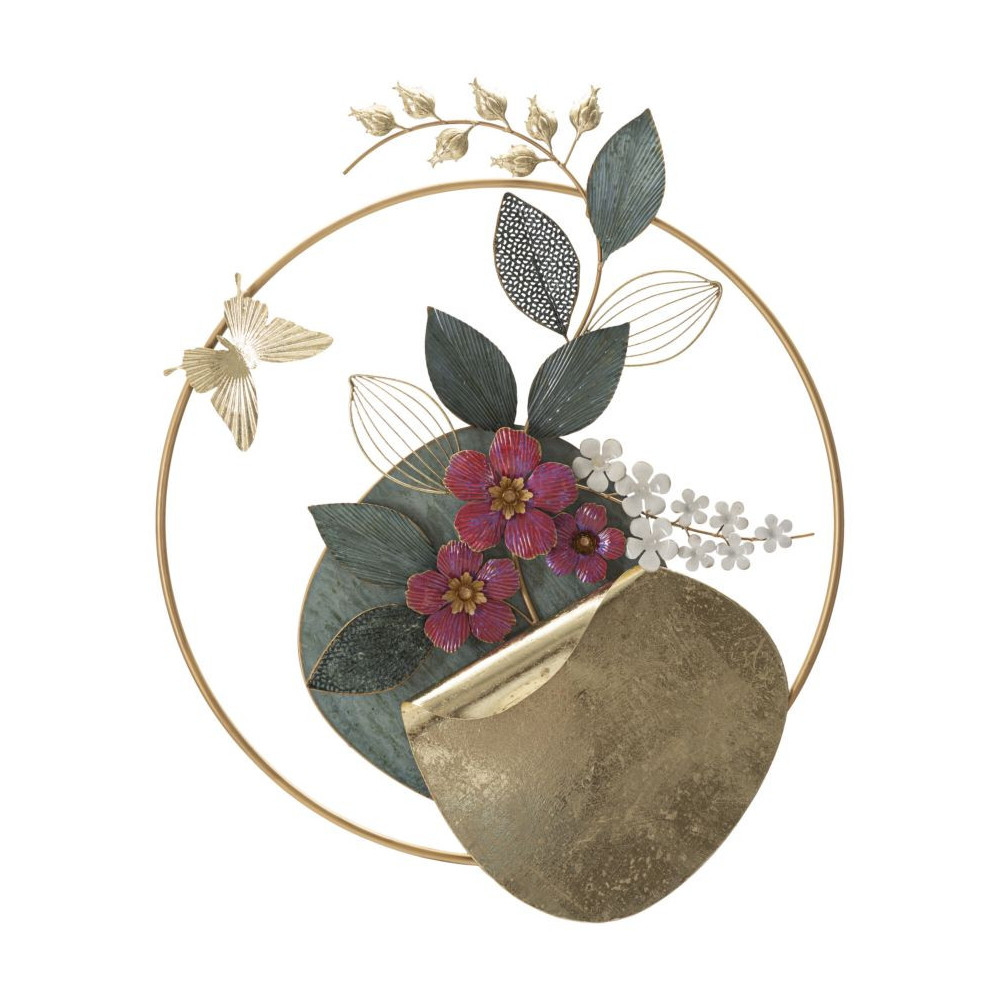 Pannello decorativo 3D da parete in metallo composto da fiori colorati e figure geometriche in un'elegante cornice rotonda.