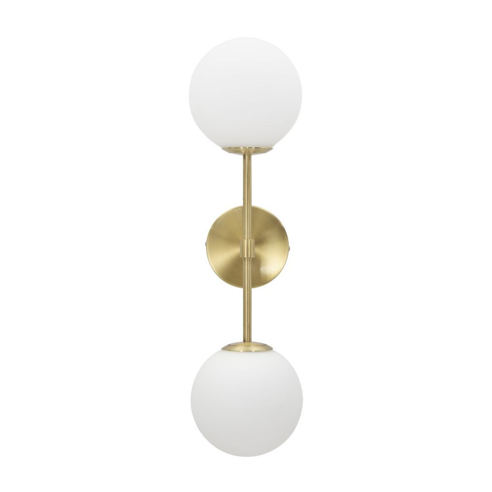 Applique con 2 punti luce in metallo dorato con sfere in vetro bianco. Le linee essenziali si sposano con l'eleganza dell'oro per creare un design unico.