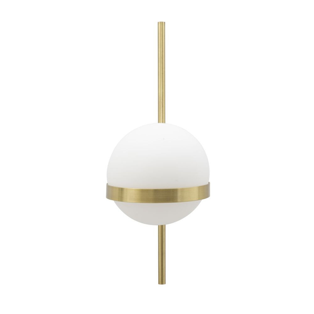 Applique in metallo dorato con sfera in vetro bianco e decorazione circolare dorata. Le linee essenziali si sposano con l'eleganza dell'oro per creare un design unico.