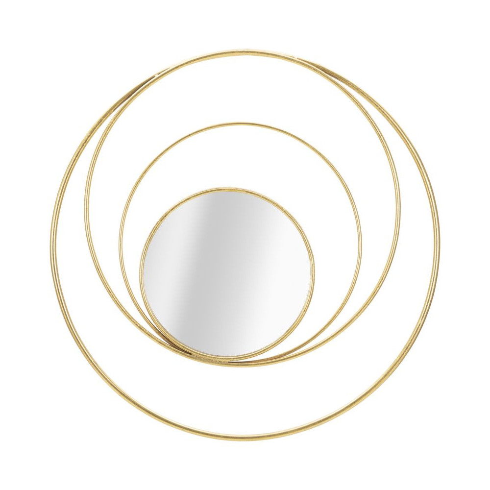 Specchio rotondo da parete con cornice dorata. Lo specchio è inserito in una serie di cerchi decorativi che richiamano un vortice. Le linee essenziali ed il particolare design donano un tocco di classe.