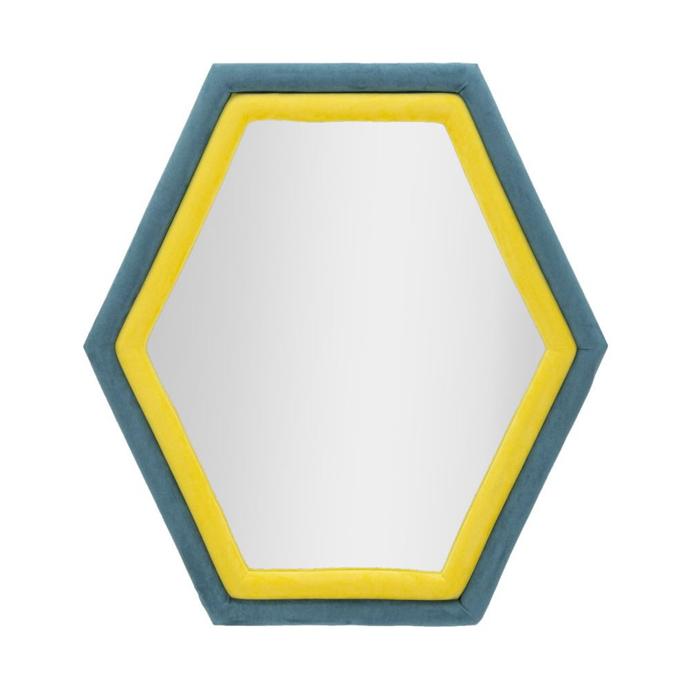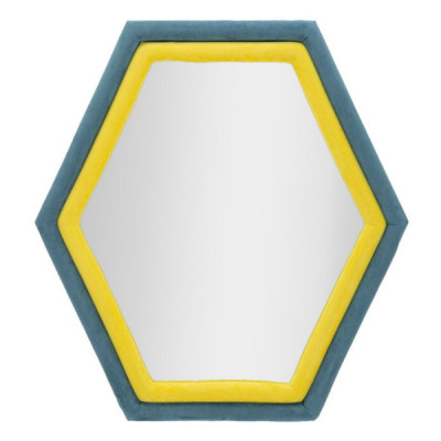 Specchio da parete esagonale con semplice cornice in legno rivestito in tessuto.