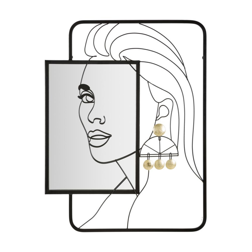 Specchio da parete incastonato in un elegante pannello in metallo nero in cui è raffigurato il volto di una donna con orecchino con parti dorate.