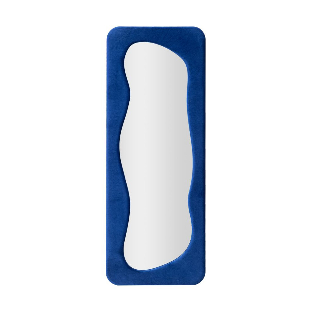 Specchio da parete con cornice in legno rivestita in velluto blu elettrico, ideale per un tocco chic e vintage nell'arredamento domestico o in ambienti dal design raffinato.