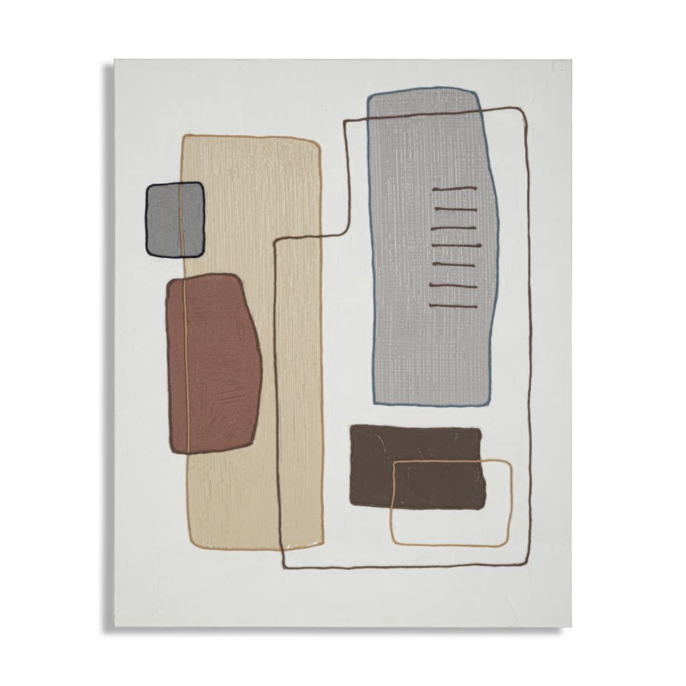 Dipinto su tela completo di telaio in legno dal design astratto con applicazioni.