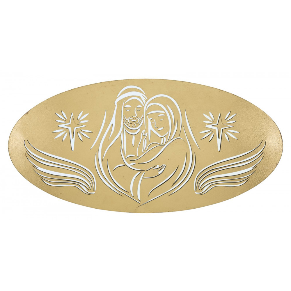 Pannello decorativo ovale 3D in metallo dorato con specchio. Il particolare intaglio crea il disegno della natività. Un tocco raffinato per ogni ambiente.