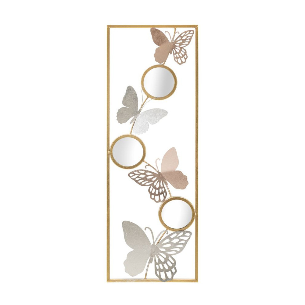 Pannello decorativo 3D da parete composto da farfalle multicolore e specchietti rotondi racchiusi in una cornice rettangolare