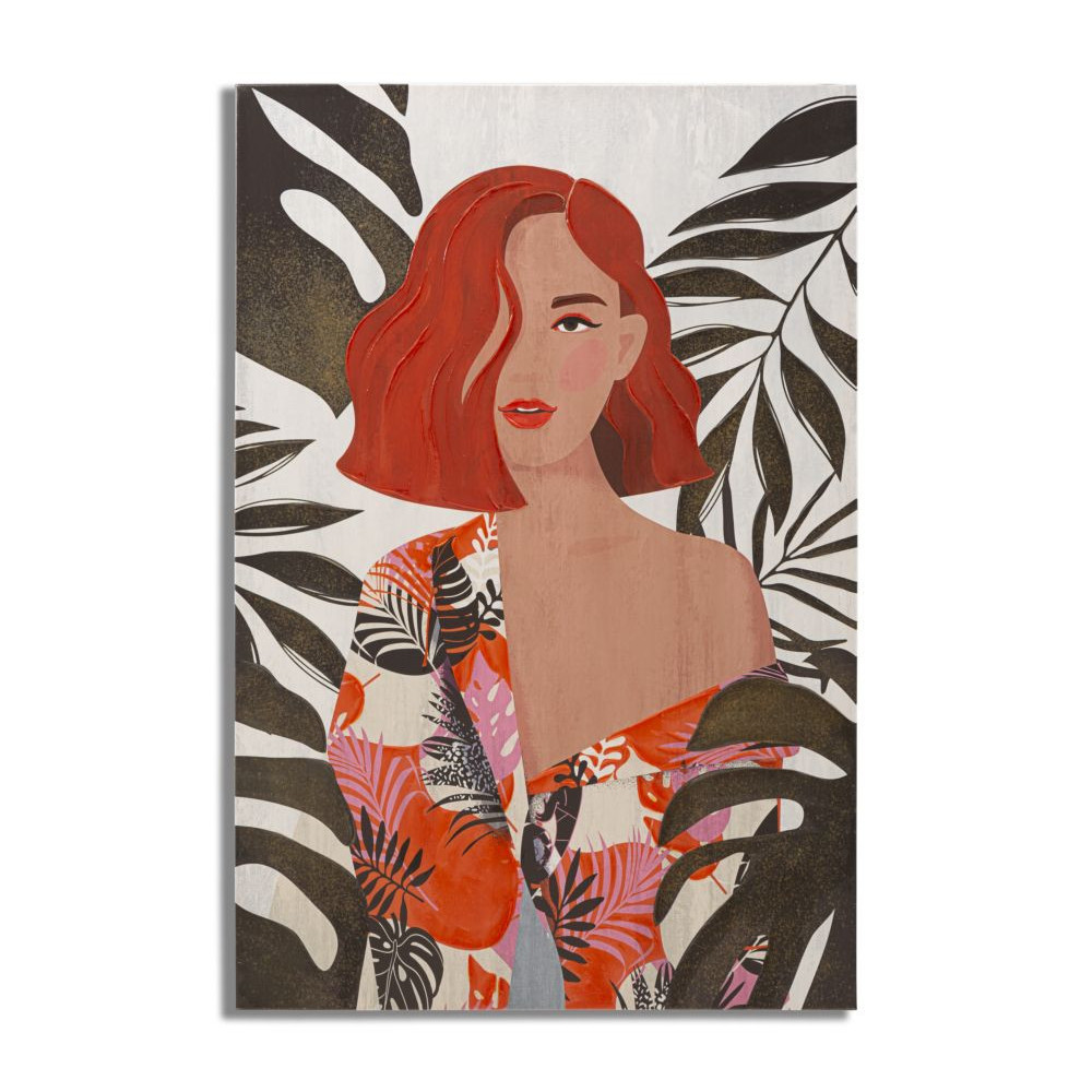Elegante stampa su tela completa di telaio raffigurante una donna con decorazioni floreali colorate e dipinte che richiamano gli ambienti tropicali donando un tocco di colore ad ogni ambiente.