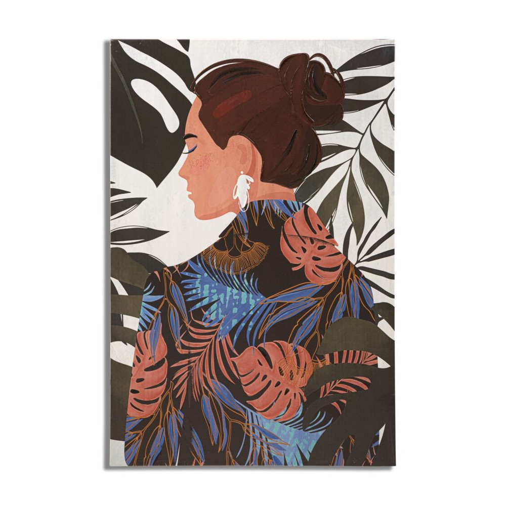 Stampa dipinta su tela con telaio in legno raffigurante una donna con delle foglie sullo sfondo dai toni caldi e accesi