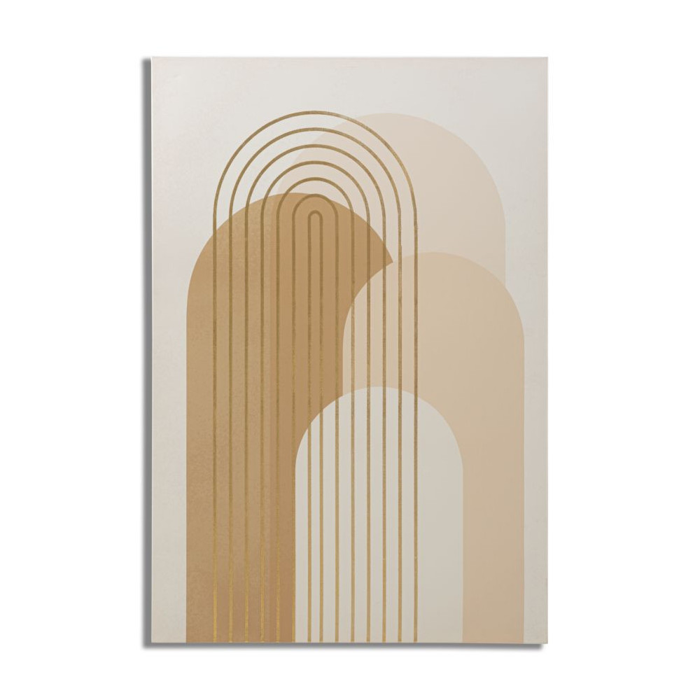 Stampa dipinta su tela con telaio in legno dal design astratto e dai toni caldi impreziositi da decorazioni dorate