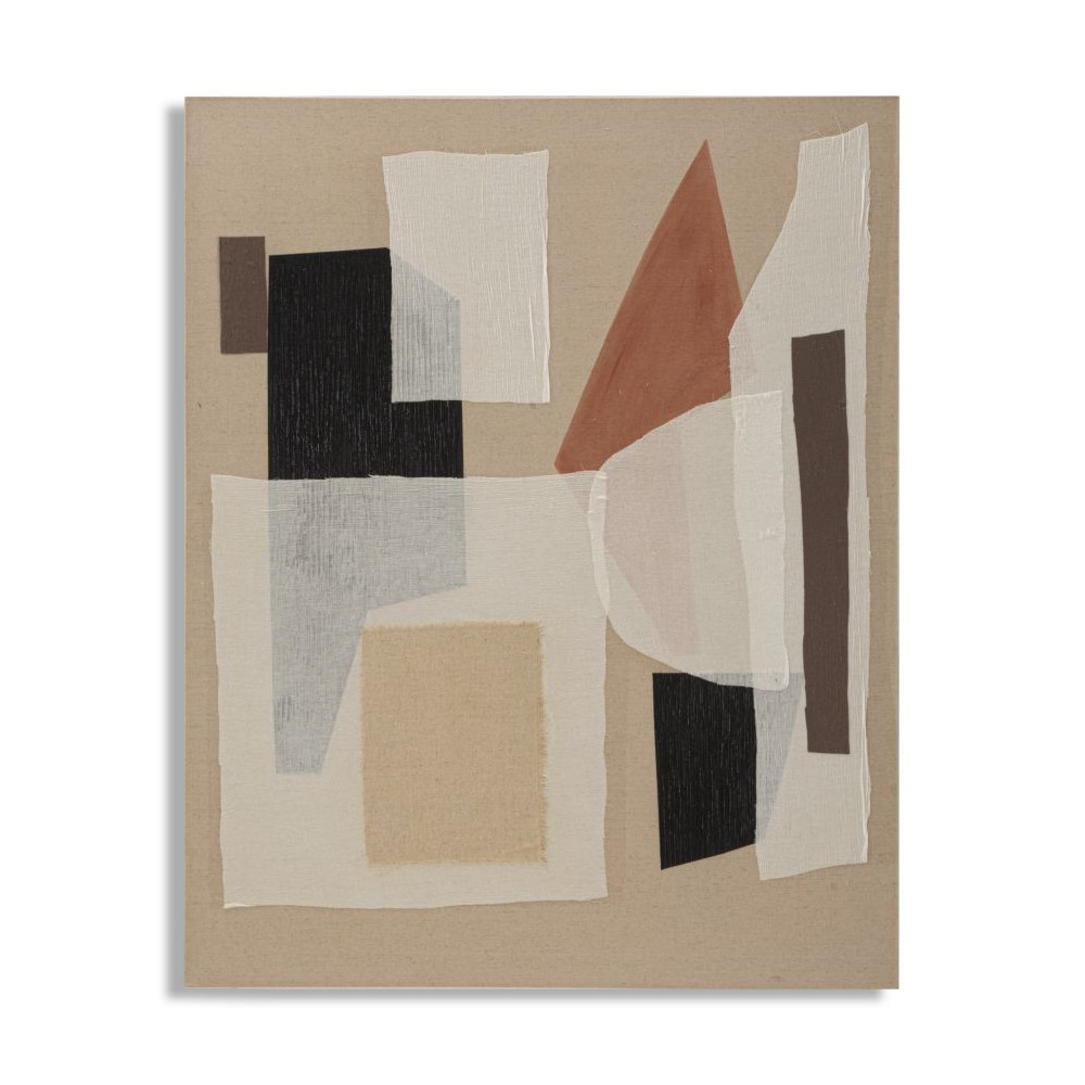 Dipinto su tela completo di telaio in legno dal design astratto con applicazioni.