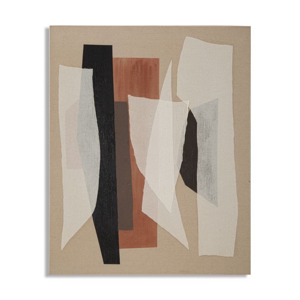 Dipinto su tela completo di telaio in legno dal design astratto con applicazioni.