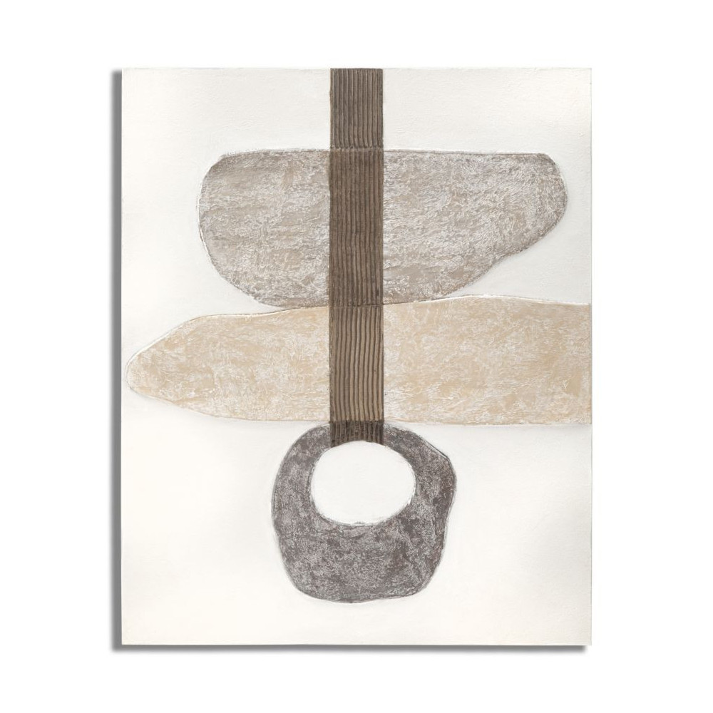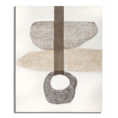 Dipinto su tela completo di telaio in legno dal design astratto con applicazioni.