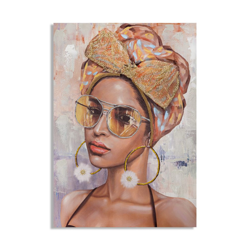 Dipinto su tela completo di telaio in legno raffigurante un volto di donna con copricapo completo di eleganti applicazioni in tessuto.