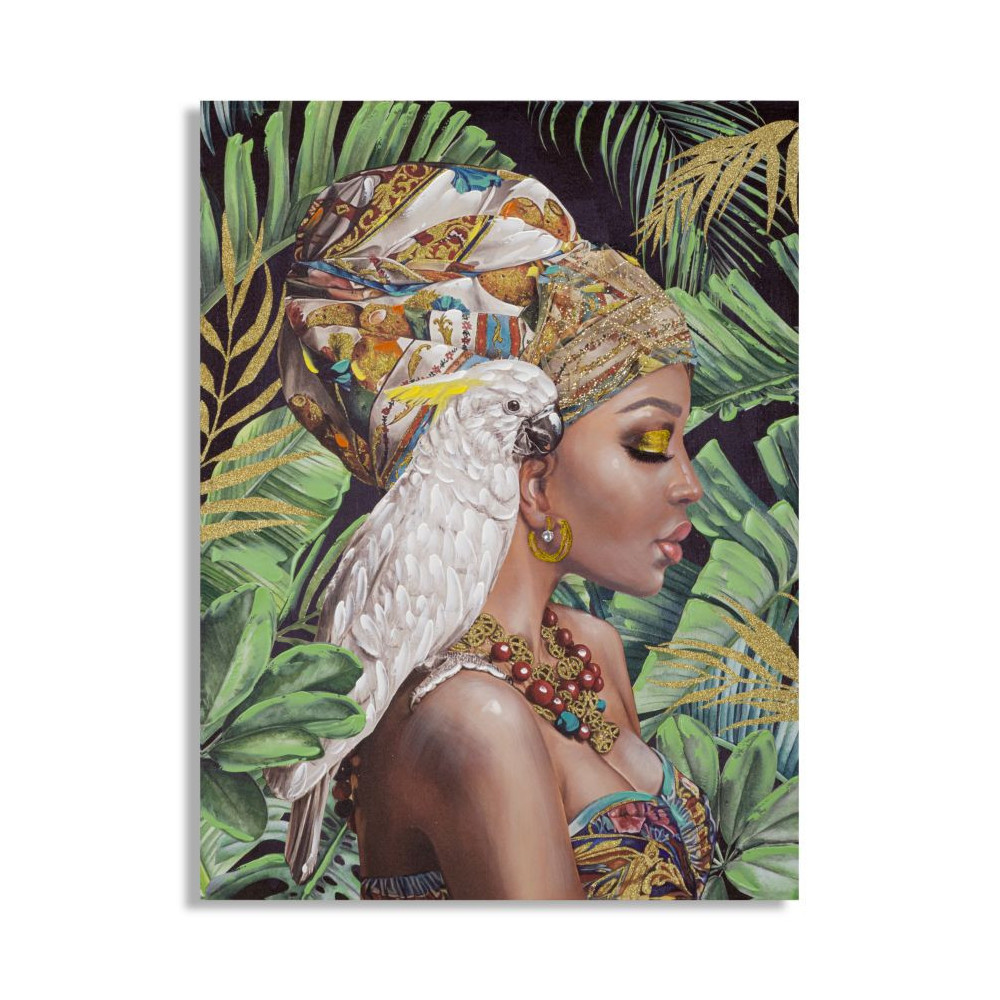 Dipinto su tela completo di telaio in legno raffigurante una donna con un pappagallo in un ambiente naturale. I colori accesi e vivaci e le eleganti applicazioni in tessuto donano un tocco di eleganza.