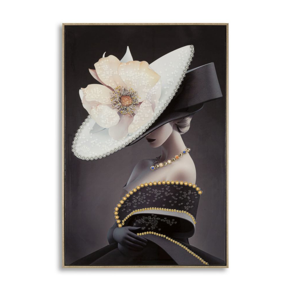 Dipinto su tela completo di telaio in legno e cornice in metallo oro con una donna che indossa un grande cappello con fiore, espressione di eleganza e raffinatezza senza tempo.
