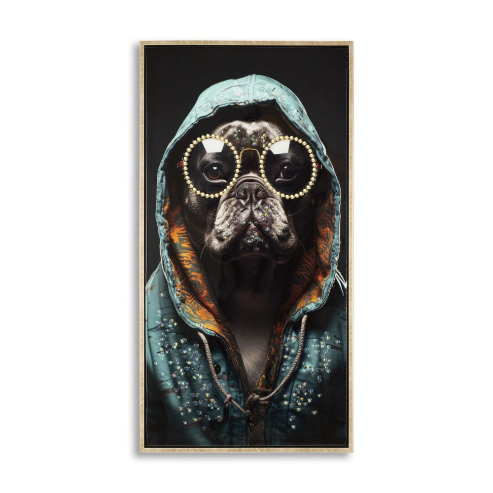 Dipinto su tela completo di telaio in legno e cornice dorata in metallo, raffigurante un bulldog con occhiali da sole, ideale per aggiungere stile e personalità a qualsiasi ambiente. Con applicazioni in rilievo.