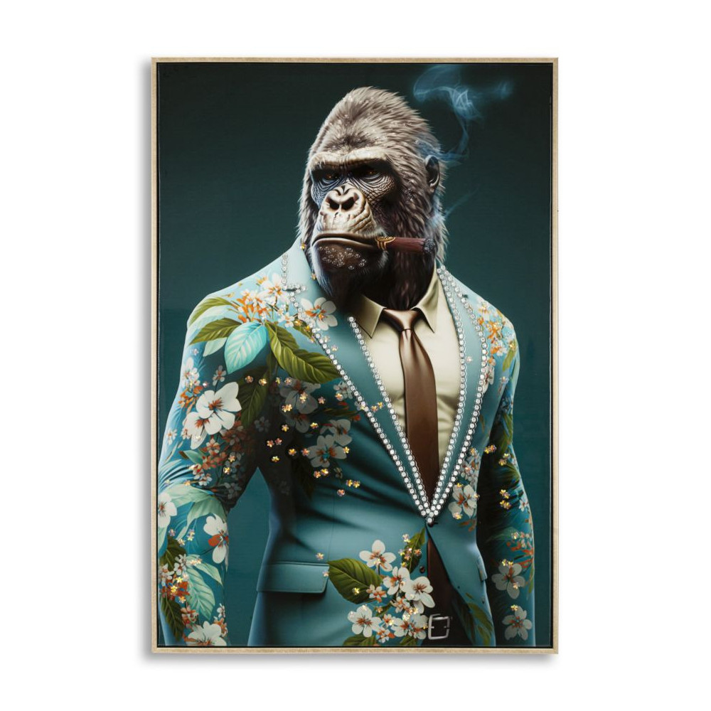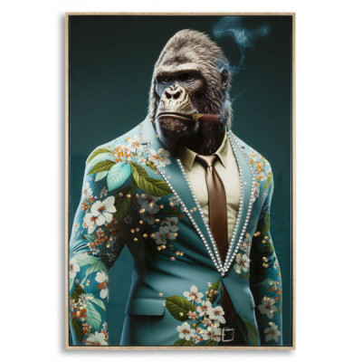 Dipinto su tela con telaio in legno e cornice dorata. gorilla che fuma un sigaro, vestito in completo elegante con dettagli in rilievo. Perfetto per dare un tocco unico a qualsiasi ambiente.