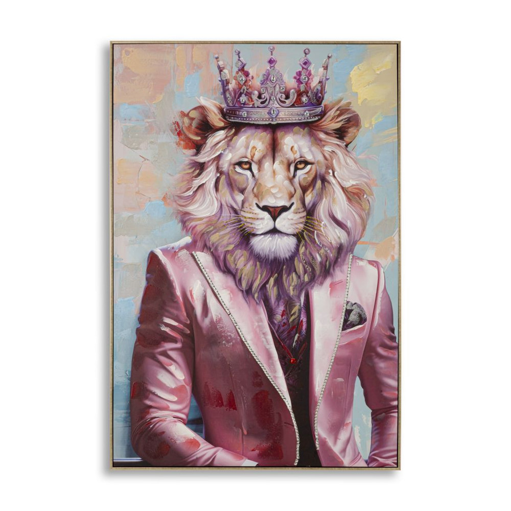 Dipinto su tela dai toni rosa con cornice in metallo dorato e telaio in legno. Leone che indossa una corona da re, stile elegante e regale, perfetto per arricchire qualsiasi ambiente con un tocco di maestosità. Con applicazioni in rilievo.