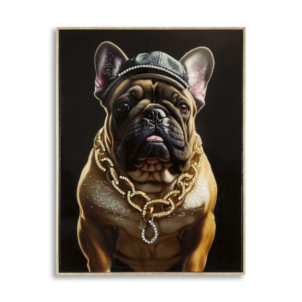 Dipinto su tela completo di telaio in legno e cornice in metallo oro. Cane bulldog con aria sicura e catena d'oro, trasmette un'energia rap degli anni '90: potente, cool, un'icona di stile e personalità. Con applicazioni in rilievo.