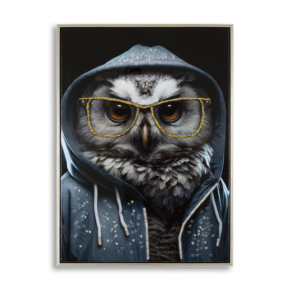 Dipinto su tela completo di telaio in legno e cornice in metallo argento con gufo che indossa occhiali dorati mentre posa con atteggiamento sicuro e cool. Con applicazioni in rilievo.