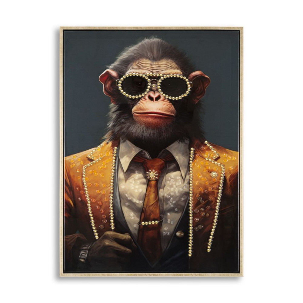Dipinto su tela completo di telaio in legno e cornice in metallo oro, scimmia che indossa un completo arancione e occhiali da sole straordinari. Con applicazioni in rilievo.