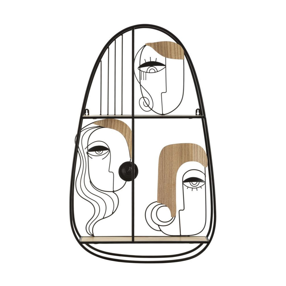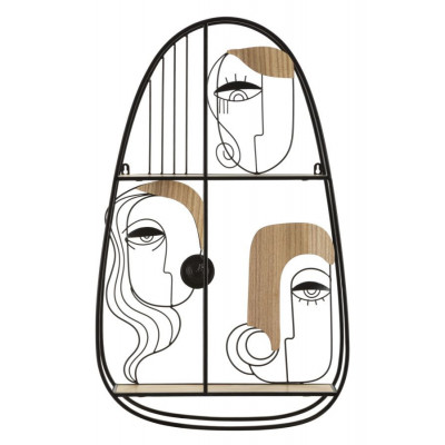 Mensola in metallo e legno dalla forma arrotondata ed elegantemente decorata con volti che richiamano l'arte cubista.